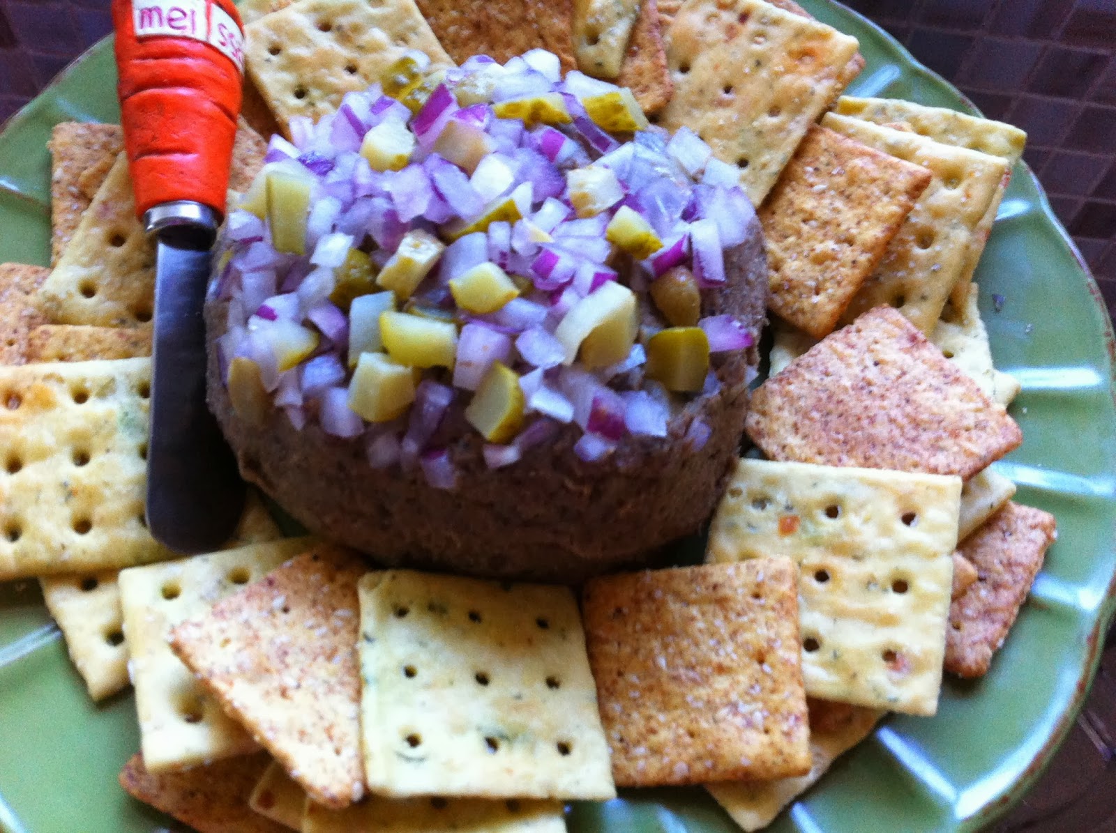 Transfer mixture to a serving bowl, or mound on a platter, garnish with diced red onion and pickles, and surround with baguette slices and/or crackers.